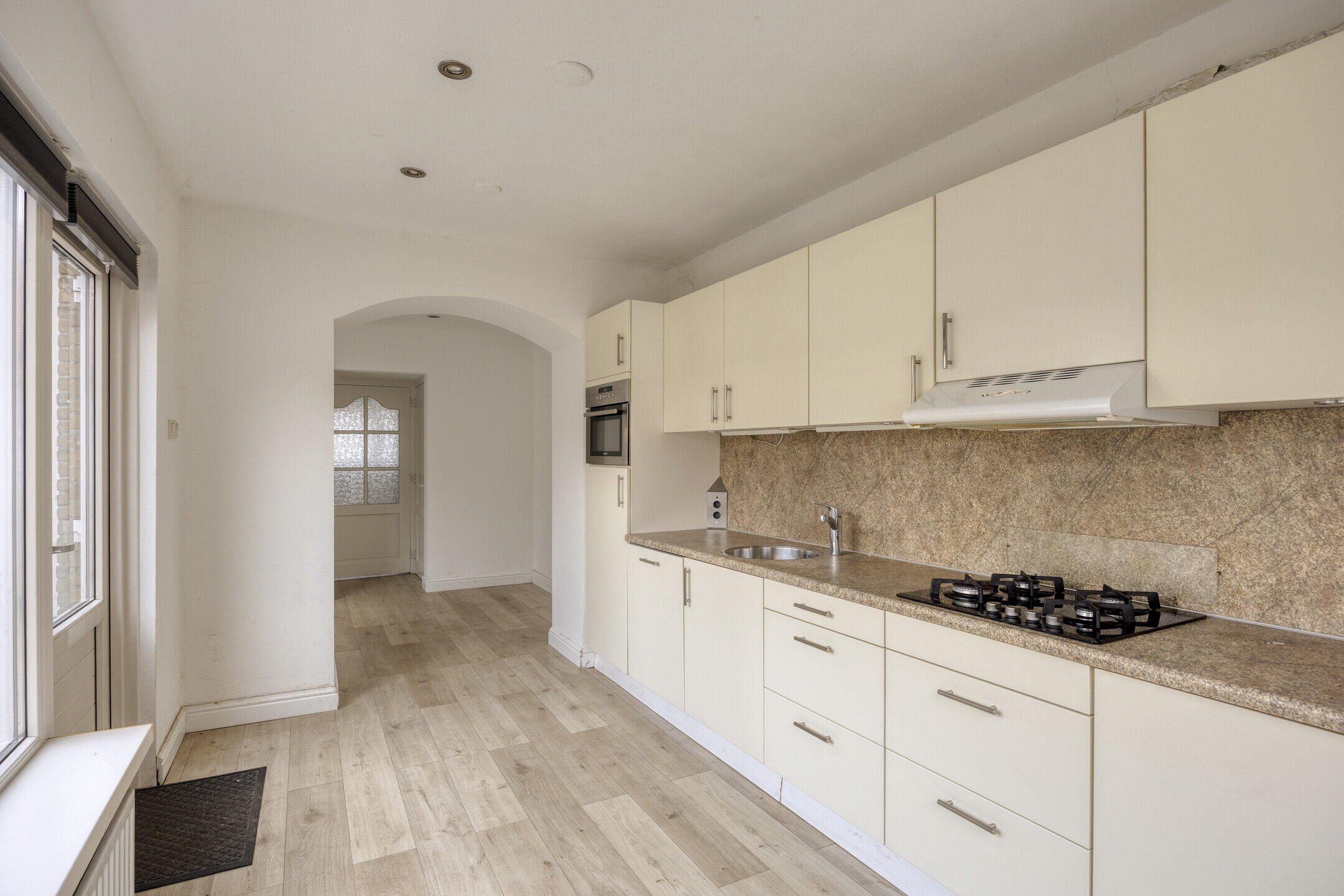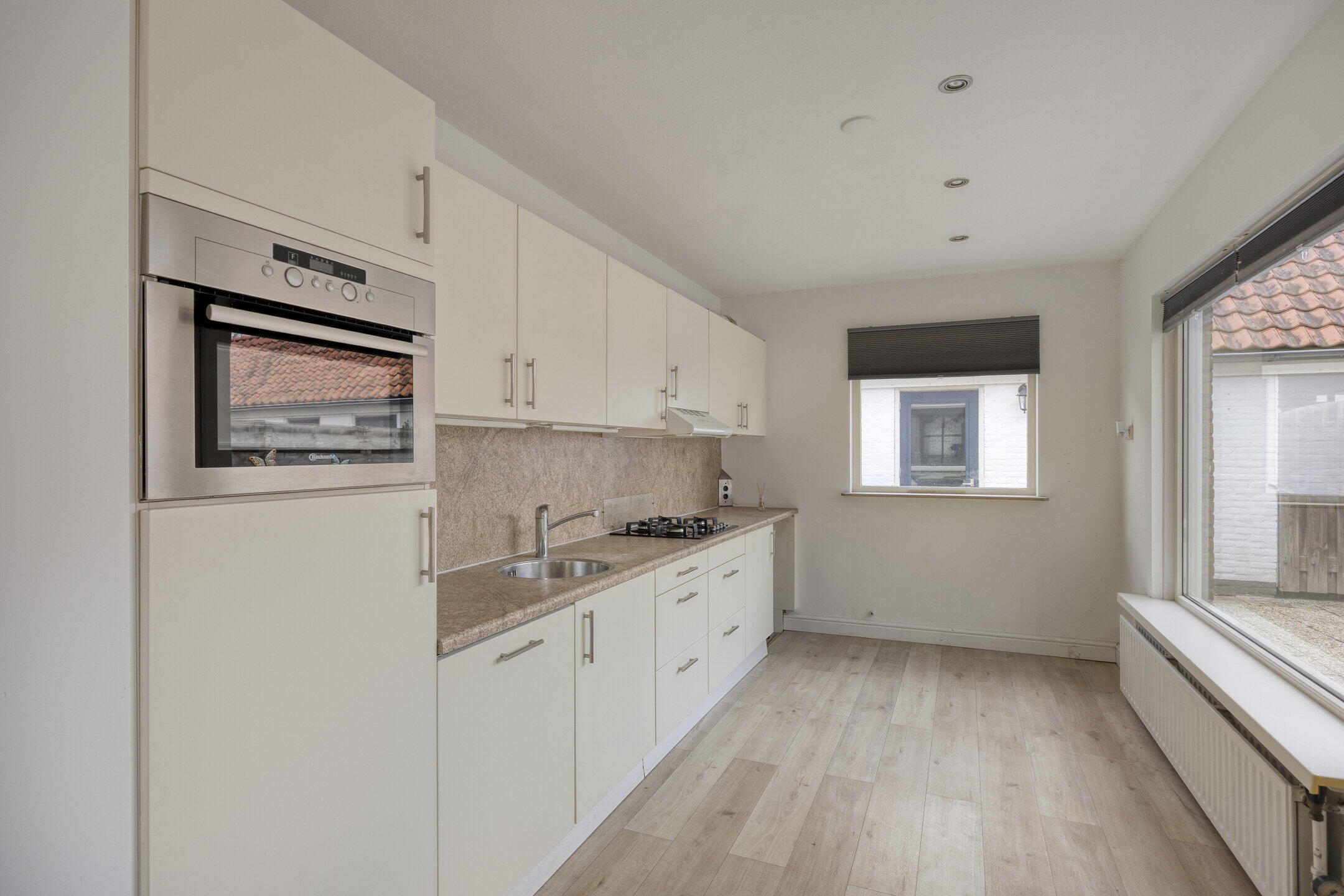 Je komt binnen in de hal met trapopgang, meterkast en een licht betegeld toilet. De woonkamer is licht en voorzien van een laminaat vloer. In de uitbouw bevindt zich de nette keuken (geplaatst in 2007) met volop kastruimte en diverse inbouwapparatuur, waaronder een koelkast, 4-pits gasfornuis, vaatwasser, combioven en afzuigkap. Hier vind je ook de aansluiting voor de wasmachine.